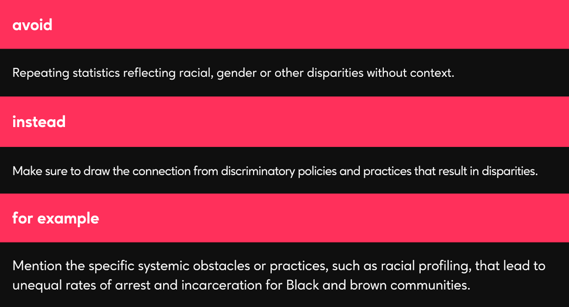 Instead of jumping straight to unequal outcomes, take the time to explain the unfair systems and inequitable treatments that lead to those outcomes. Otherwise, many audiences will inaccurately assume that unequal outcomes happen because some groups are simply more prone to crime.