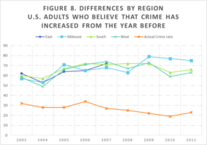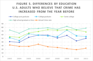 Belief that crime had increased “in the last year” dramatically declined in the 1990’s, from 71% in 1996 to 41% in 2001, running parallel with the decline in actual violent crime victimization rates (from 65% in 1996 to 33% in 2001) (Saad, 2013). However, shortly after September 11, 2001, opinion that crime was increasing quickly shot back up and remained above 50%, with a peak of 74% in 2009, despite continued decreasing crime rates. More recently, despite the setback in battling crime in the past two years, Americans are slightly more, rather than less, positive about the crime rate. Most interestingly, different demographic groups perceive the crime rate differently.