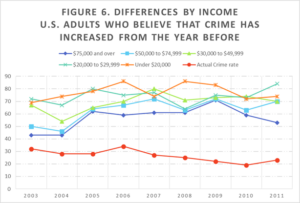 Finally, why would those with the lowest educational attainment believe that crime is increasing to a much greater degree than those who’ve achieved higher education? And why would those with the lowest incomes perceive crime to be greatest, while those with the highest incomes perceive there to be much less crime in the United States? Could these trends have something to do with the different personal experiences of people within these different groups?