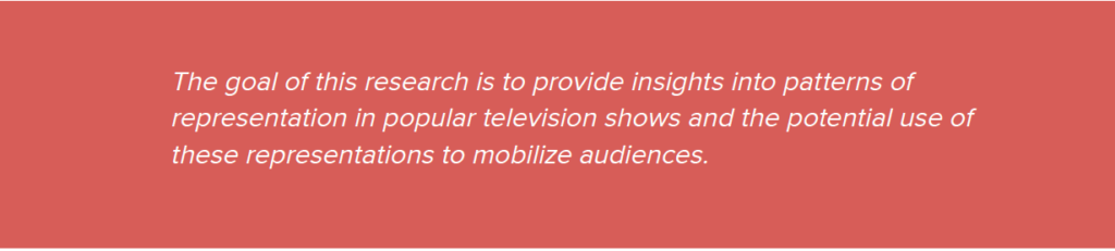 The goal of this research is to provide insights into patterns of representation in popular television shows and the potential use of these representations to mobilize audiences. As such, this research makes use of both qualitative and quantitative content analysis methods. However, because of the relatively small sample size compared to the overall population, it is important to note limitations in the generalizability of our research findings. In future studies, we aim to analyze a larger sample size, including a survey of the impact of these representations on the directly impacted.