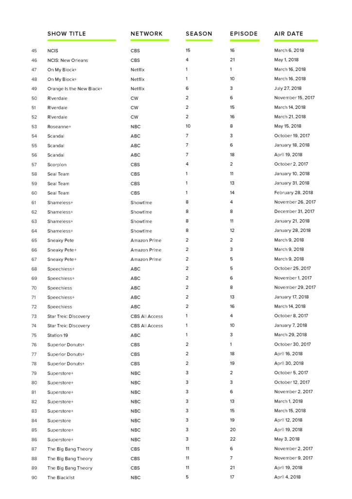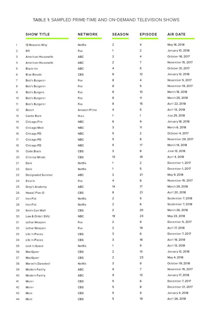For the purpose of this study, popular television shows were defined as shows that attracted a large general audience when originally aired on broadcast and cable networks in the United States and/or shows that were ranked high on Parrot Analytics’—the singular source compiling international demand for streaming plat-forms—The Global Television Demand Report: Full Year 2018.[5] In an effort to better capture these emergent consumer habits, our population of popular television shows was generated using a combination of traditional rating metrics from consumer habits research firm Nielsen[6] and viewership measurements compiled in the Global Television Demand Report.