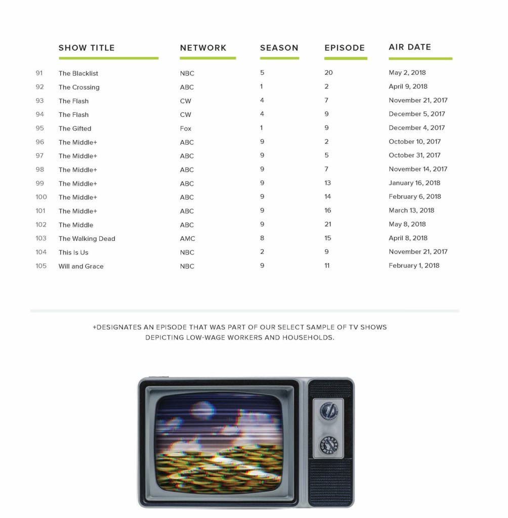 The television analysis in this report is based on content analysis of 105 randomly sampled television episodes from popular television shows aired on broadcast, cable, and streaming services divided into 70 episodes reflect-ing the gamut of shows available during the Fall 2017 to Spring 2018 season and an additional 35 episodes reflecting low-wage workers from this same period.