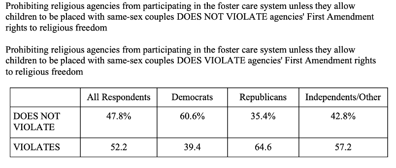Recent public opinion research is helpful in assessing how to respond to this case and the others that are before the Court this term. A recent study polled a nationally representative sample of 2,158 American adults about their views on upcoming Supreme Court decisions[1] The SCOTUS Study asked respondents whether they believed that requiring foster agencies to place children with same-sex couples violated the foster agencies’ right to religious freedom, and 52.2% of the public stated that it does violate these agencies’ right to religious freedom.