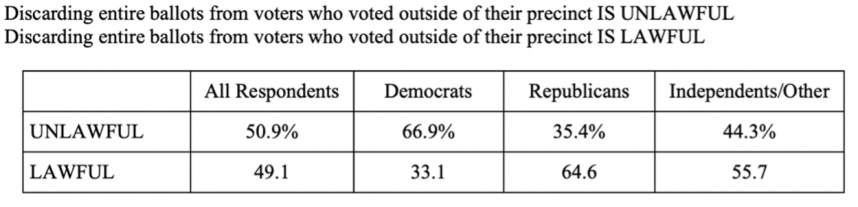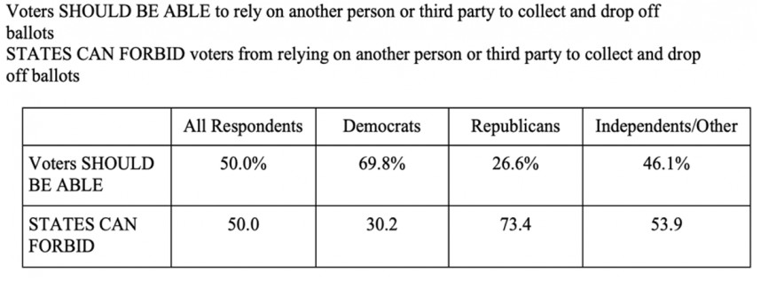 Following Donald Trump’s false claims about the 2020 election, his followers have initiated a massive effort to both continue the drumbeat promoting fraud and suppress voter turnout in many states. For example, Arizona passed a law that (1) prohibits people from getting assistance from others to drop off their ballots on their behalf, and (2) requires that provisional ballots be automatically discarded when a voter votes in the wrong precinct. According to the SCOTUS Study, voters are evenly split on how the Court should resolve these two issues.